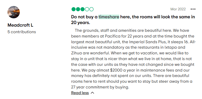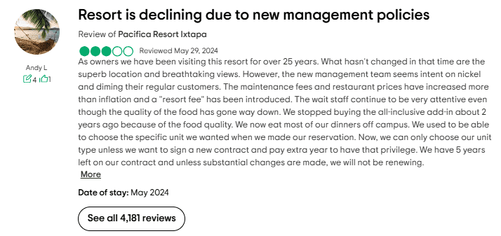 Pacifica Resorts hasn’t escaped criticism for declining quality over time. Long-term guests have noted changes that feel less like “updates” and more like “cost-cutting measures.” Increased fees, reduced services, and a new “resort fee” have left a sour taste for many. One reviewer pointed out that maintenance fees and restaurant prices have outpaced inflation, making it harder to justify the expense of owning a timeshare here.