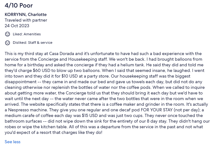 - Sky-High Costs Without the Luxury: From unexpected fees to overcharging for basic amenities, the price tag of staying at Casa Dorada has left many guests scratching their heads. Charges for mundane items and services often go unexplained, leaving a bad taste long after the stay.