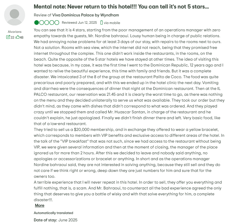 - Timeshare Sales Practices: Perhaps the most consistent, and troubling, theme across reviews is the aggressive push for timeshares under the Viva Vacation Club. Guests describe being repeatedly approached by sales staff offering “special gifts,” “exclusive tours,” or “limited invitations.” What starts as a friendly interaction quickly turns into a high-pressure pitch that can drag on for over an hour. Many travelers describe sales reps as persistent to the point of harassment. If you refuse or say you don’t have a credit card handy, the tone can shift from pushy to dismissive. Worse, guests often mention that the promised gifts, bottles of rum, cigars, or small souvenirs, never materialize if they decline the timeshare. This aggressive approach not only frustrates vacationers but leaves a particularly bitter taste for those who signed into a timeshare contract and later realized the promises didn’t live up to reality.