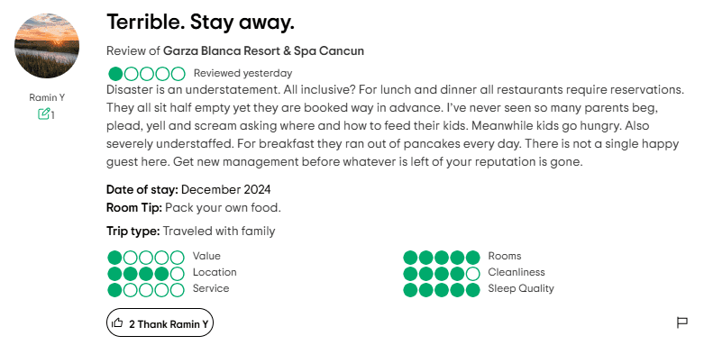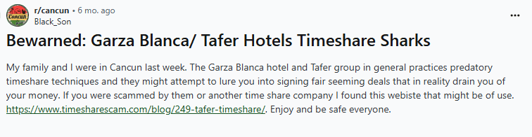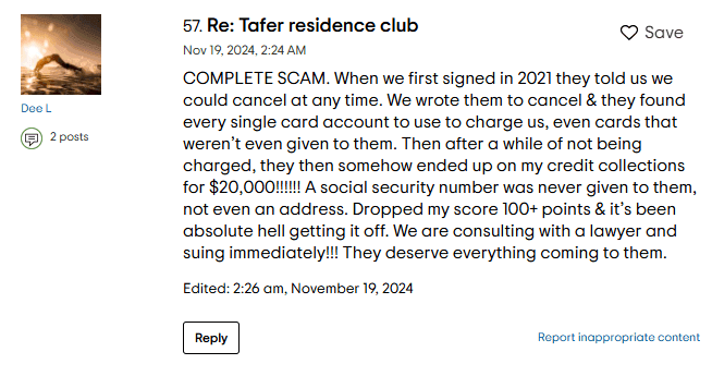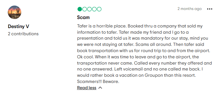 On TripAdvisor, there’s a thread that even to this very day, almost near the end of 2024, users continually warn against joining Tafer’s "Residence Club." By the way: it’s a timeshare, despite what the brochures might call it. New complaints are added regularly, with warnings about misleading sales tactics and unmet expectations.