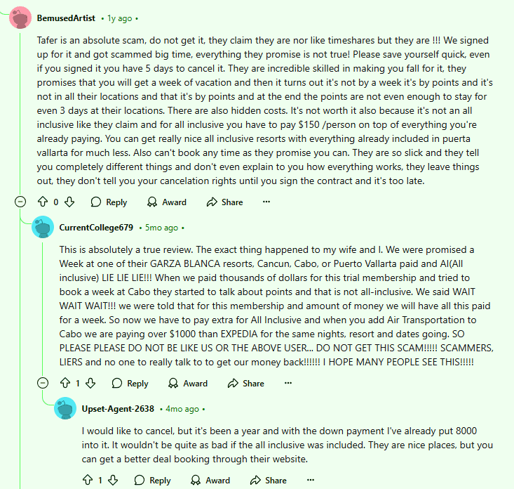 Type "Tafer Resorts scam" into Reddit, and you’ll stumble into a treasure trove of complaints. Common threads include pushy sales tactics, such as inviting potential customers to breakfast only to lock them into high-pressure pitches where leaving feels impossible.