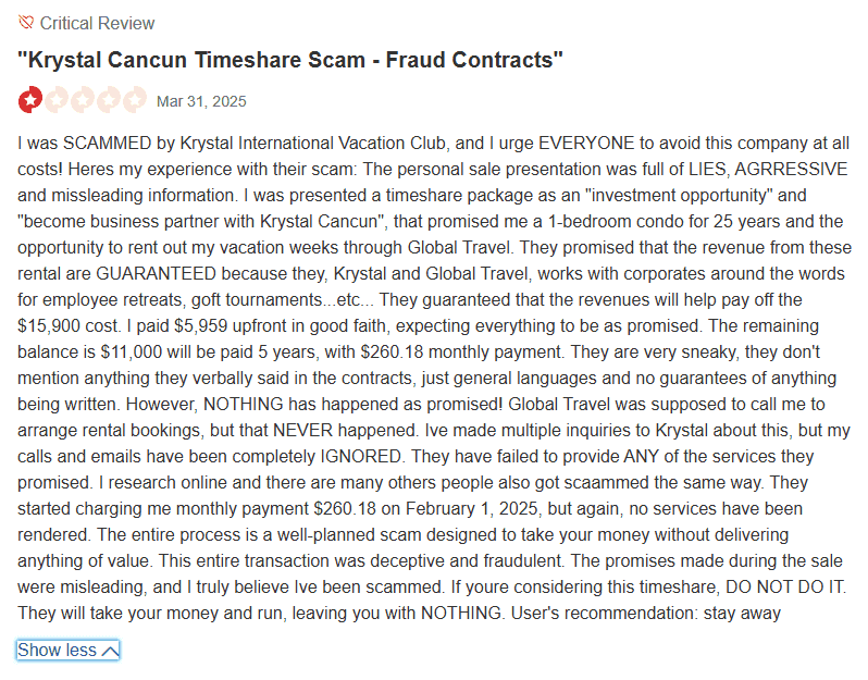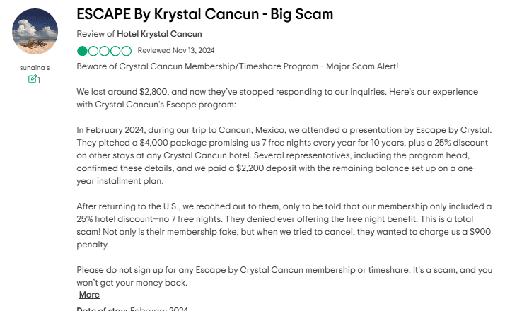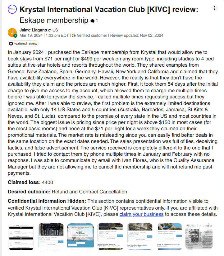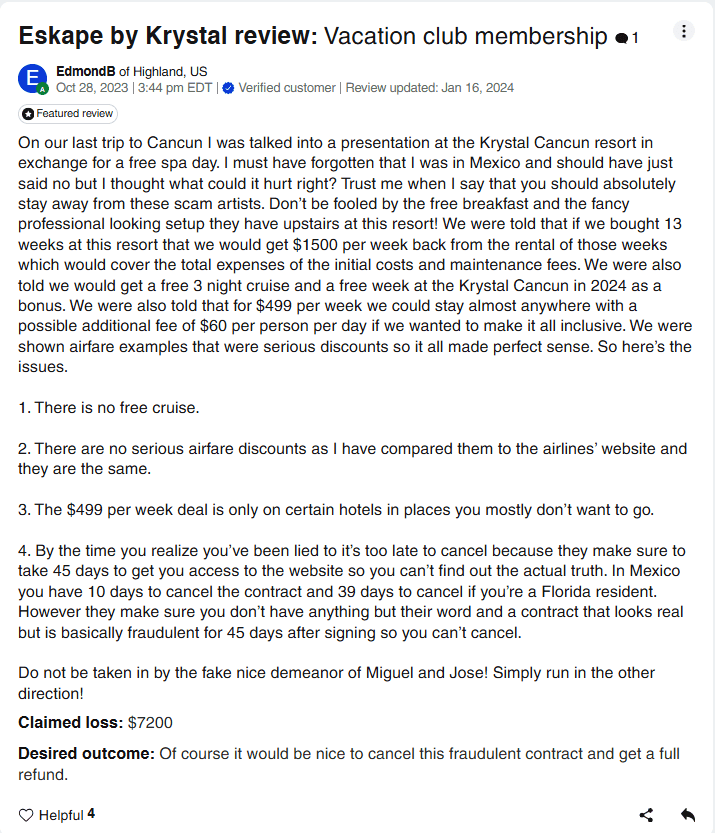 One of the most frequent complaints about Eskape by Krystal is the mismatch between what sales reps promise and what actually ends up in the contract. Members report being told they’ll receive “7 free nights per year for 10 years,” only to find that what they really bought was a discount program, offering maybe 25% off hotel stays, with multiple restrictions.