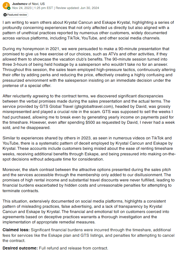 Given the number of unresolved complaints, the high-pressure sales process, and the frequent issues with benefits not being delivered, many people are turning to timeshare exit services to get out of their contracts with Eskape by Krystal.