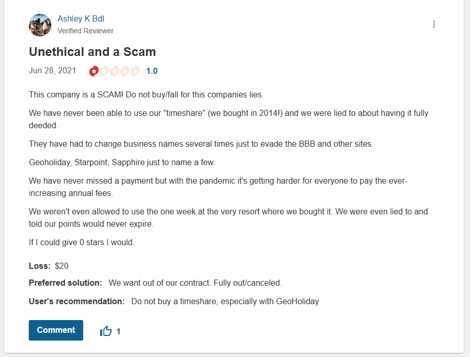 GeoHoliday (now Starpoint, now Sapphire, and who knows what next) has a long track record of customer dissatisfaction, questionable business practices, and evasive tactics. If you’re feeling trapped in your contract, know that you are not alone, and options exist to help you exit.