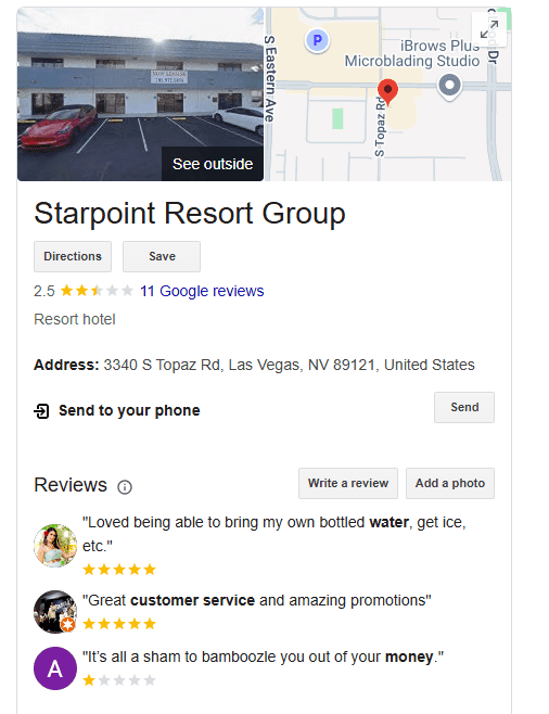Adding to the concerns, Google Maps directs those searching for Starpoint Resorts to an abandoned parking lot.