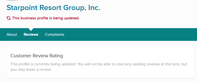 While researching GeoHoliday’s BBB profile, it was discovered that it had been mysteriously removed and replaced with Starpoint Resort Group, Inc. The new profile includes a notice that it is “being updated,” effectively removing all previous negative reviews.