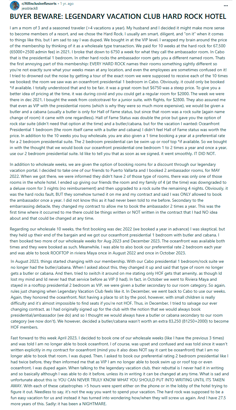 5. Issues with Legendary Vacation Club (Timeshare Program): One of the most frequently cited concerns is the aggressive promotion of the resort’s membership program, Legendary Vacation Club. Guests reported being persuaded to attend sales presentations with promises of benefits, only to encounter high-pressure tactics and misleading contract terms. Many found the cancellation process to be confusing or restricted, leading to long-term financial commitments they later regretted.