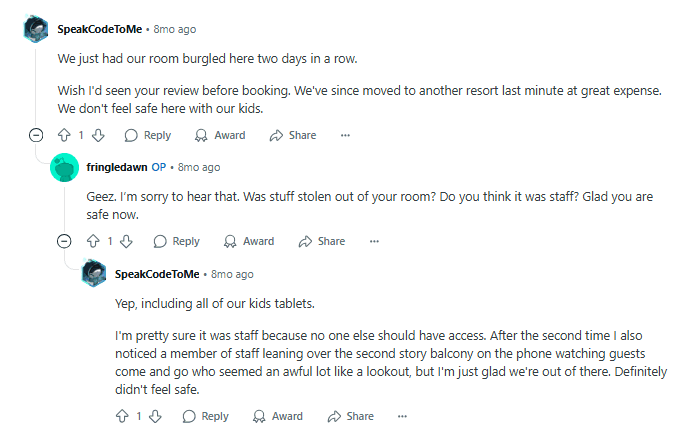 4. Safety and Security Concerns: Several visitors reported thefts from their rooms, raising concerns about internal staff involvement. In many cases, the resort’s response was seen as inadequate or dismissive.