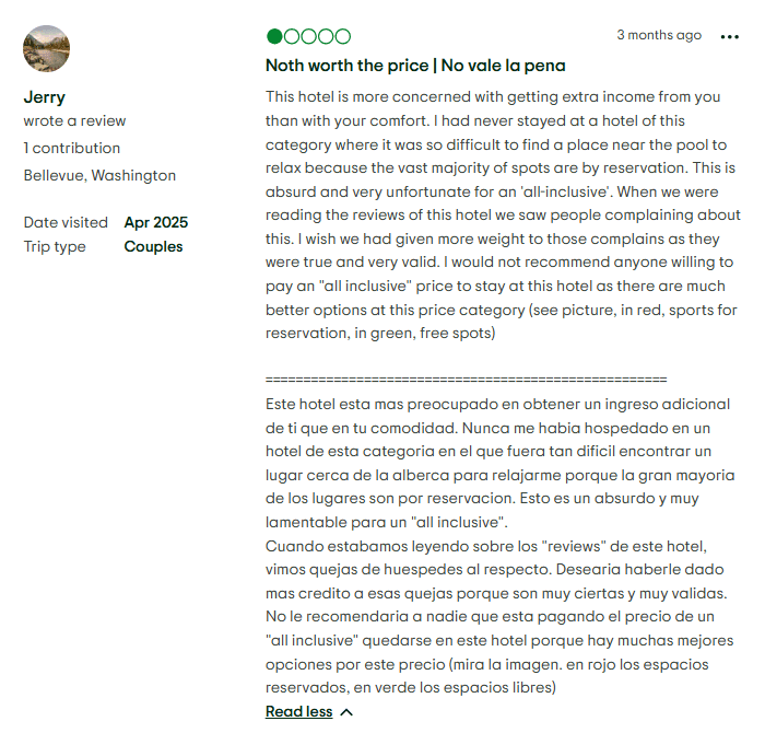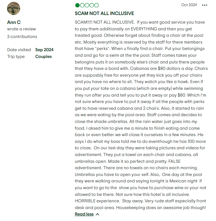 - Subpar Drink Experience: Guests have flagged problems with drink quality, often describing cocktails as weak, bland, or watered down. There have been complaints about inconsistent liquor brands, slow bar service (especially at the beach or pool), and lackluster mixology, which feels out of step with the brand’s upscale promises.