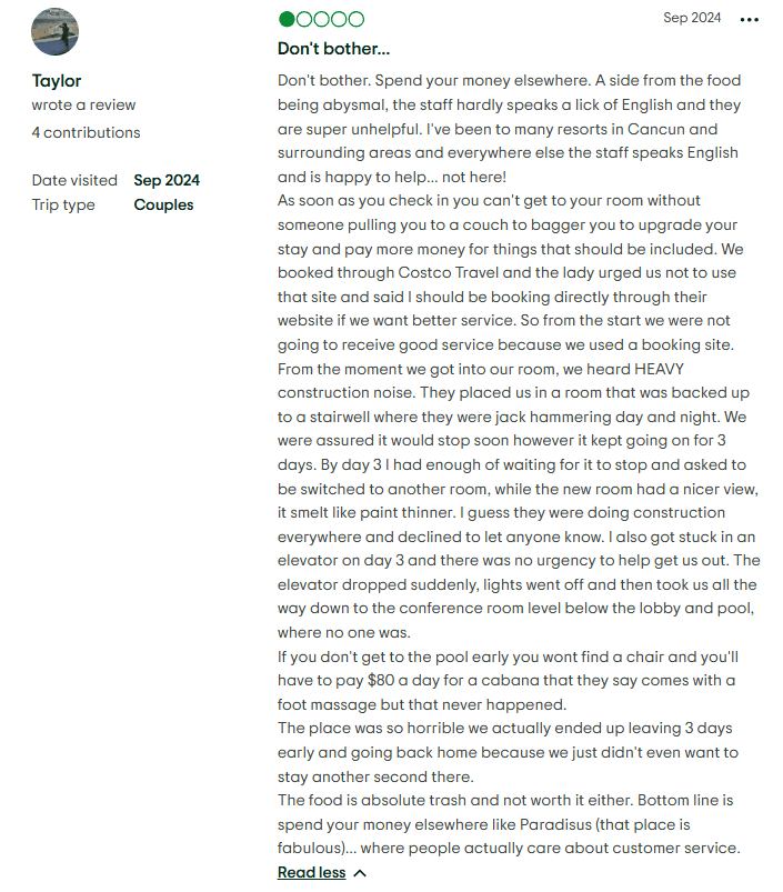 - You're disappointed with the resort's food, drink, or service quality