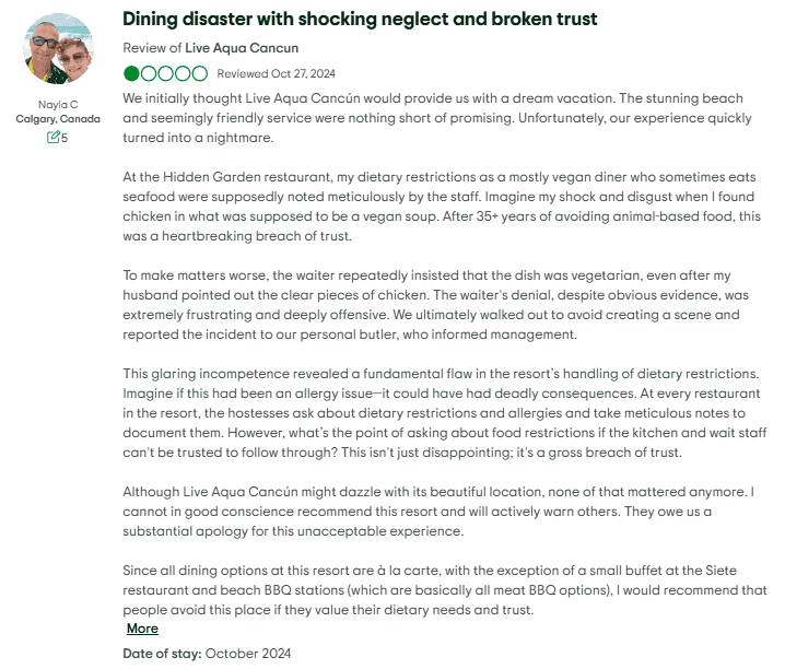 - Dining Quality Issues: Many guests report that the food is average at best, a big letdown when the resort markets itself as gourmet. Compared to other luxury all-inclusives like Hotel Xcaret Arte or Excellence, Live Aqua often falls short on flavor, variety, and presentation. Some restaurants are packed with little room between tables, and slow service is a frequent issue.