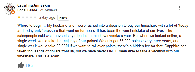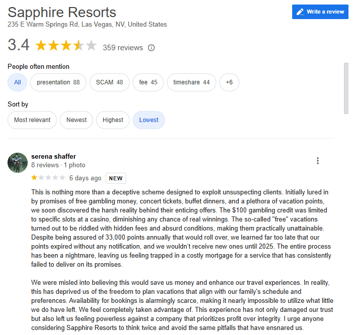While Sapphire Resorts has 359 Google reviews with an average rating of 3.4 stars, a deeper dive reveals a high number of negative reviews. Many customers express regret over their purchases and frustration with the company’s customer service.