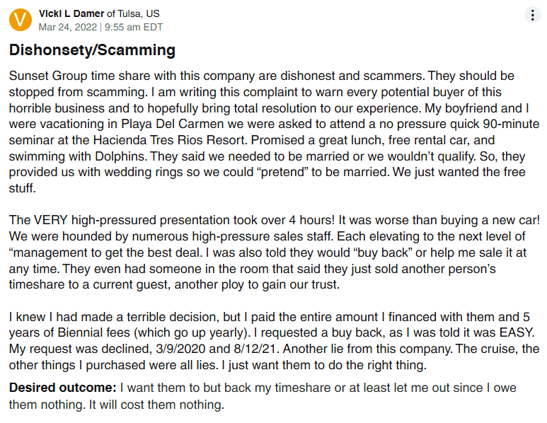 Many customers allege they were misled during sales presentations. One of the most common complaints involves sales reps promising that the company would buy back their timeshare after a certain period. That never happens. Instead, buyers find themselves stuck with a timeshare they don’t want and can’t use.