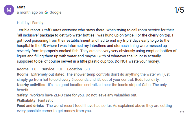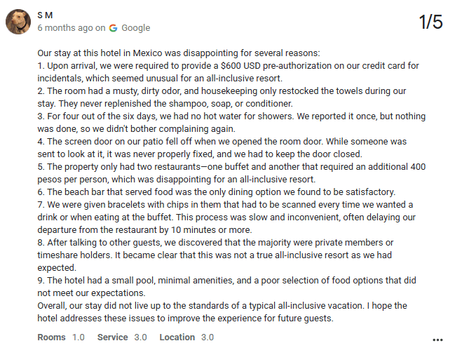 One serious report involved a guest who believed their drink had been tampered with, causing physical symptoms. Despite informing resort management, the guest reported receiving no follow-up or resolution.