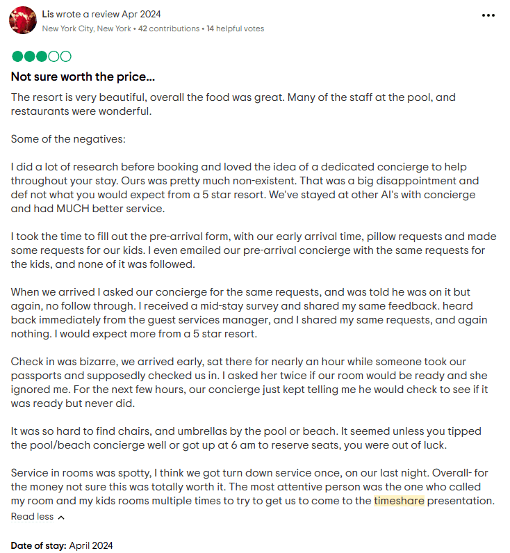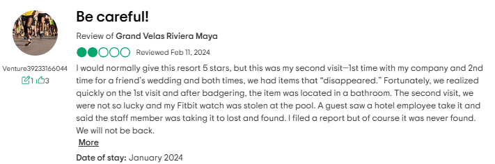 4. Security Concerns: Some travelers have had worrying experiences, including items reported missing from rooms. A guest at Riviera Maya claimed their Fitbit disappeared; while the staff claimed to have found it, it was never returned. While this isn’t the norm, it’s enough to make you cautious, especially when ownership contracts make you feel trapped.