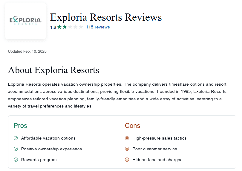 Additionally, Exploria Resorts has received notably low ratings on consumer review platforms, reflecting widespread dissatisfaction. The company currently holds a 1.8-star rating on ConsumerAffairs based on 115 reviews and a 1.17 rating from 89 reviews on the Better Business Bureau (BBB), further highlighting these ongoing issues.