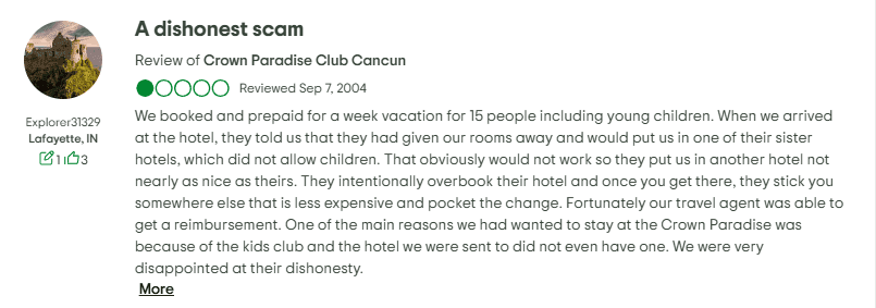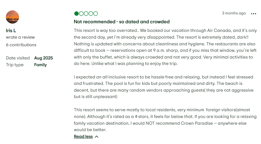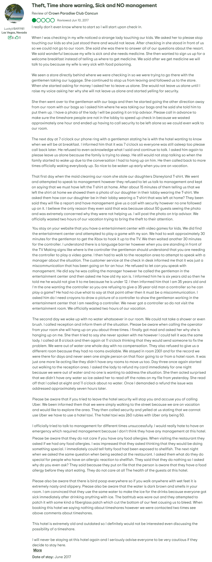 Theft / Security and Timeshare‑Pressure Claims: Some guests have shared concerning stories about aggressive timeshare sales practices and a few incidents suggesting lapses in security. Multiple visitors describe being approached persistently by sales representatives during their stay, sometimes immediately after check‑in. These interactions, initially framed as friendly conversations or short presentations, reportedly stretched into lengthy, high‑pressure sales pitches. In some cases, travelers claim they were promised benefits or discounts that never materialized. A smaller number of online comments refer to alleged thefts or misplaced valuables, though not all were verified or connected directly to staff. Regardless, the combination of sales pressure and security concerns has contributed to the resort’s uneven reputation among guests.