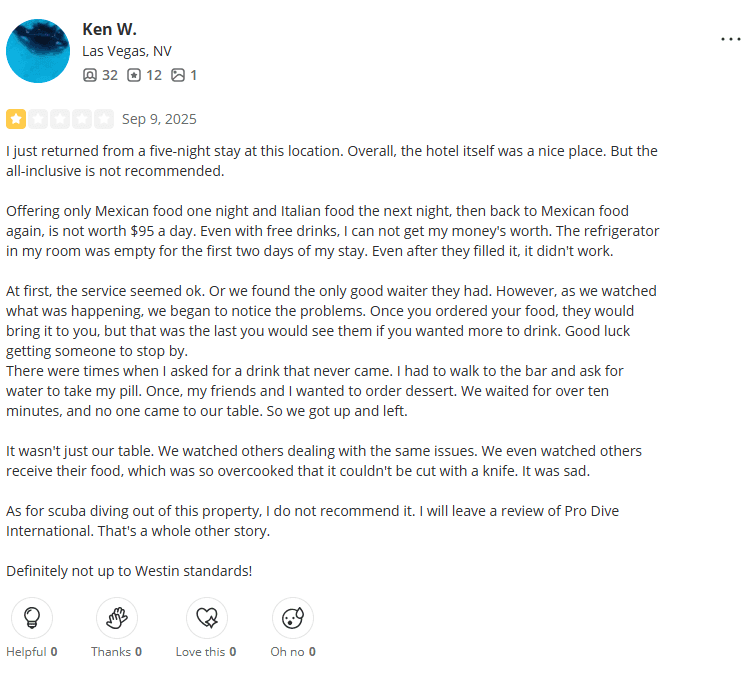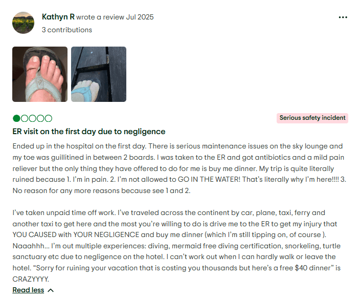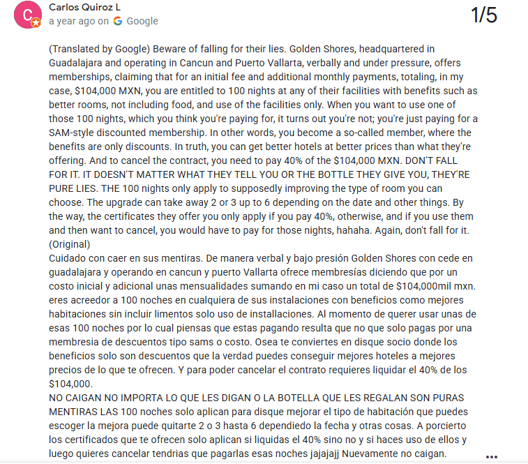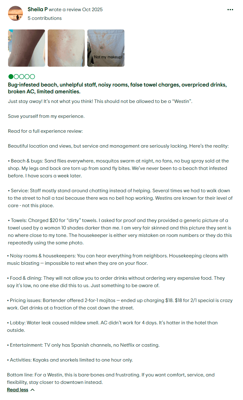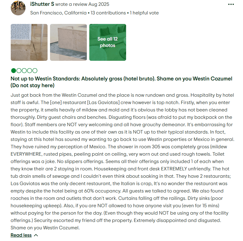 Poor Guest Accommodations and Safety Concerns: Although not every visitor experiences major issues, several guests have reported receiving poor treatment and inadequate service from resort staff. There are also accounts describing deteriorating conditions within certain affiliated properties, including reports of unsafe facilities. In one case, a guest at The Westin Cozumel claimed to have been injured due to these conditions —raising questions about the overall maintenance and safety standards of the resorts associated with Golden Shores Vacation Club.