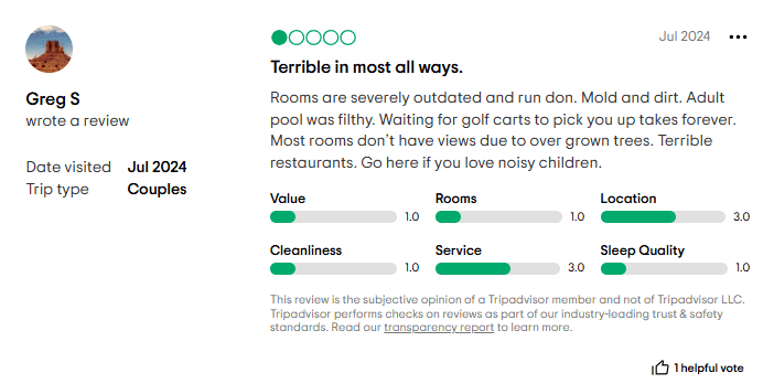 A significant number of guests have voiced dissatisfaction with the resort's high-pressure timeshare sales presentations. Many described prolonged sessions that began casually but evolved into hours-long, hard-sell encounters. Complaints often include being misled about the details, costs, and long-term implications of ownership agreements, leaving buyers feeling trapped in arrangements they did not fully understand.