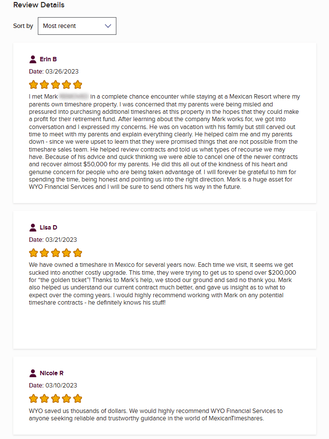 Wyo Financial Services presents itself as a timeshare-exit company focused specifically on Mexican resort contracts. While specialization can be a strength, in their case it also narrows the scope: anyone seeking help with a broader range of timeshare issues may quickly discover that WYO simply isn...