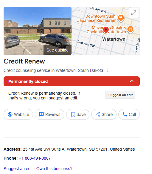 The Credit Renew Problem: But here’s where things unravel. Credit Renew’s social media presence has been dead since 2021, with near-zero engagement. A deeper search reveals a permanent closure notice tied to their office address. Even more suspicious is the connection: both Credit Renew’s and Cancel Timeshare’s BBB pages list the same individual, Charles R. Howard, as owner and contact. In other words, Cancel Timeshare appears linked to its own now-defunct “partner.”