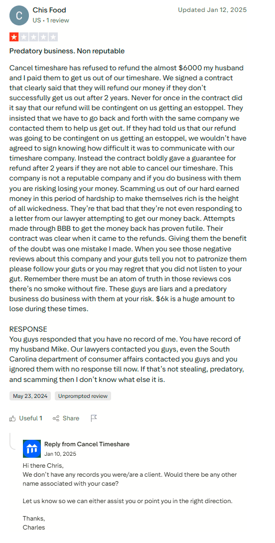 The Takeaway: Cancel Timeshare positions itself as a professional exit firm, but between false rating claims, ties to a shuttered credit company, and a steady stream of negative reviews, the risks are simply too high. While the clear pricing is a small positive, the bigger picture points to credibility issues and consumer distrust.