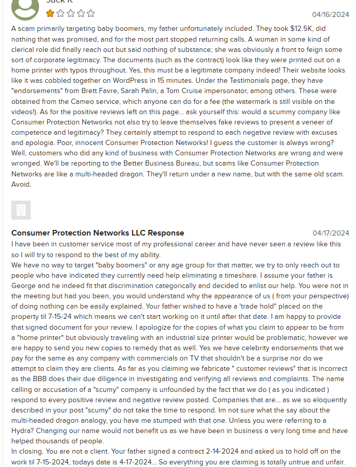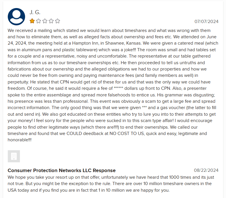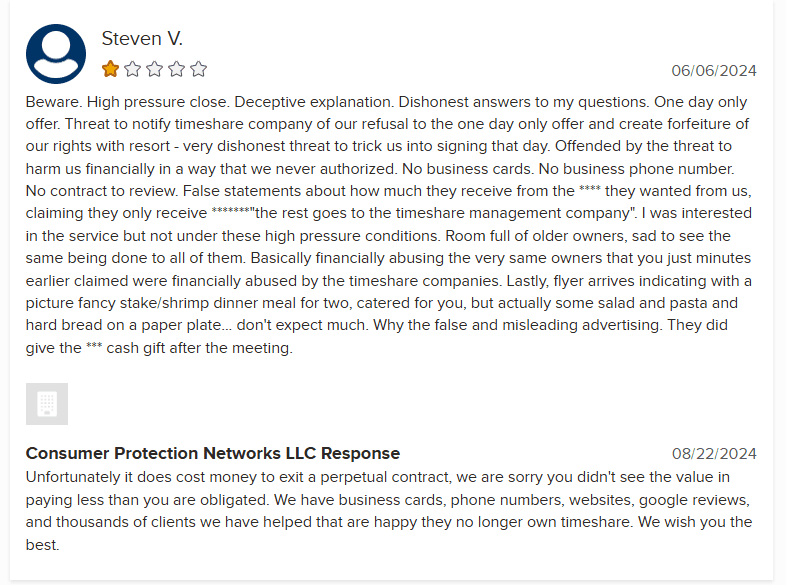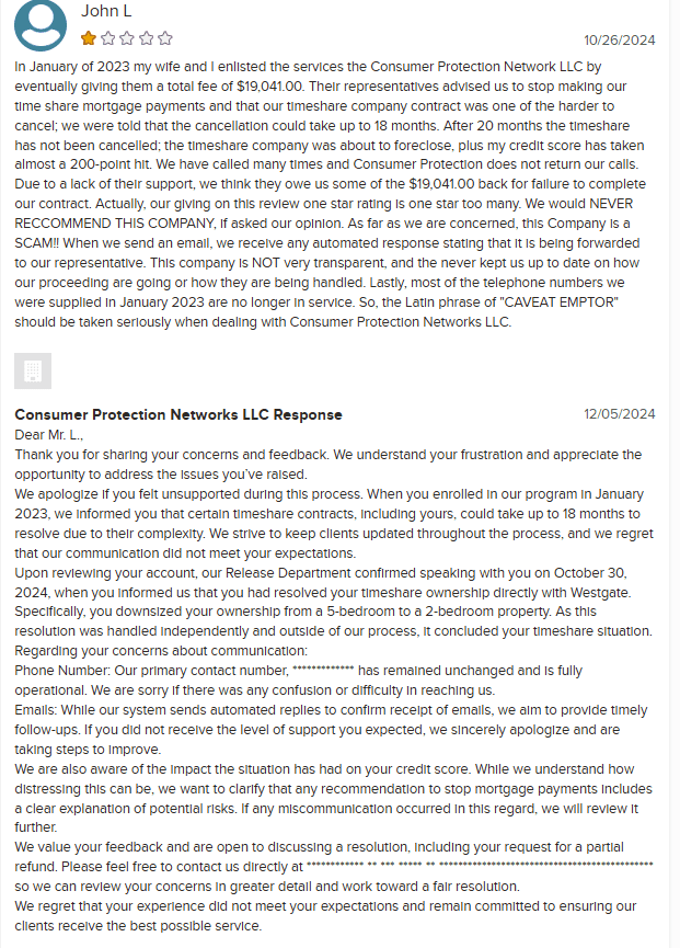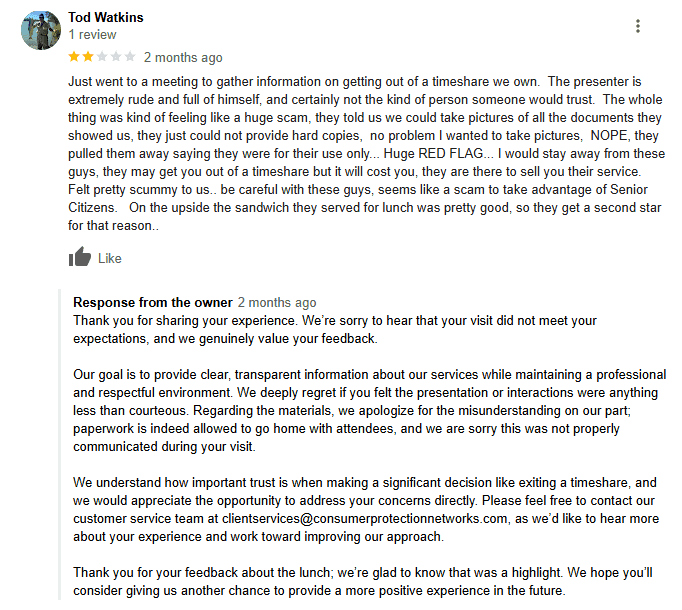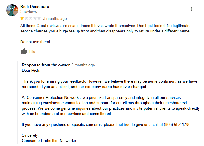 Consumer Protection Networks (CPN) is another timeshare cancellation company with a dubious reputation and a perplexing online presence. While their website boasts a Google review rating of 4.8 stars from 16 reviews, the ratio of positive to negative feedback raises eyebrows. Only two reviews are 1-star, which suggests that the overwhelmingly positive reviews may be fabricated.