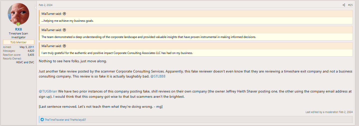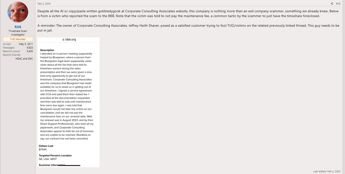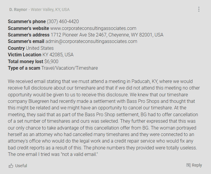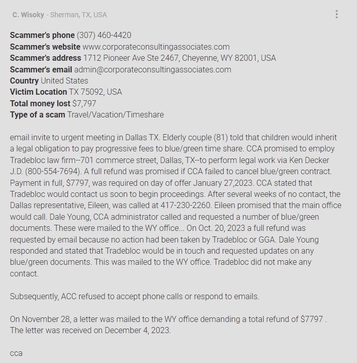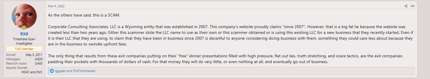 In short: Corporate Consulting Associates is not a company to be trusted. Their multiple domain names, fake reviews, desperate attempts at self-defense, and ties to known fraudsters paint a clear picture. This is a timeshare exit scam with a history of deception, and it should be avoided at all costs.