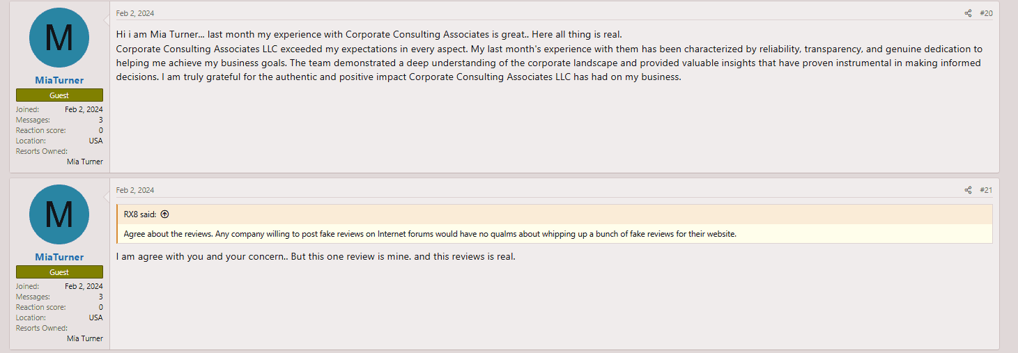 One particularly sloppy mistake stands out on the .com domain: a duplicate review under the name “Mia Turner.” That blunder became important later, when CCA tried to defend themselves on the popular TUG timeshare forum. Their attempt to post under a fake account was so transparent that users quickly caught on, and mocked them for it.