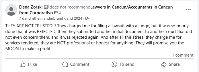 Corporativo FSUâs lack of transparency, inconsistent online presence, and troubling customer interactions make it hard to recommend their services. While they offer legal and accounting advice, potential clients should approach with caution. The absence of a functional website, coupled with a reputation marred by negative feedback and unprofessional behavior, paints a picture of a firm struggling to establish trust and reliability. For those seeking legal or financial assistance in CancĂșn, exploring alternative options might be a wiser choice. Based on the available information, Corporativo FSU deserves a 1-star rating.