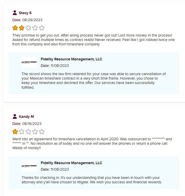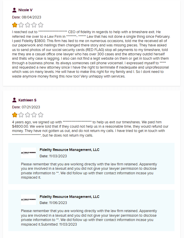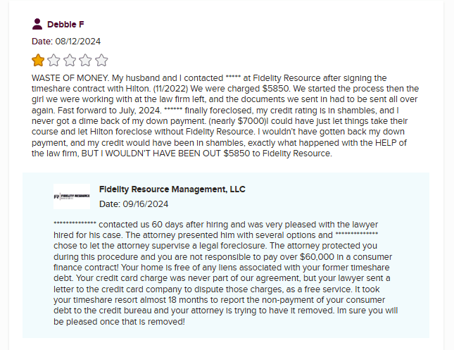 Fortunately, FRM does have reviews spanning multiple years, even if they are relatively sparse. Reviews from 2025 trend more positively, with some users reporting satisfactory outcomes. However, looking back to 2023, we observed a noticeable cluster of complaints. Many of these negative reviews allege that FRM allowed timeshares to fall into foreclosure as a method of “exit,” rather than securing a clean and properly documented cancellation. Several former clients also reported negative impacts to their credit scores, which they attribute to FRM’s failure to resolve matters responsibly or transparently.