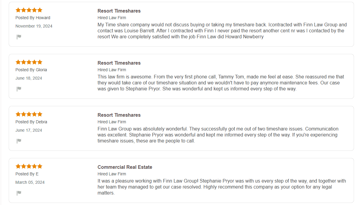 In summary, Finn Law Group positions itself as a specialized legal service provider in the timeshare dispute arena, with a focus on both consumer advocacy and legal representation. While no firm is immune to criticism, Finn Law Group’s overall reputation is supported by strong reviews across multiple platforms and a demonstrated commitment to resolving client concerns. For those considering their services, conducting thorough due diligence—including reviewing feedback, verifying fees, and seeking client testimonials—is essential to ensure a good fit for individual needs.