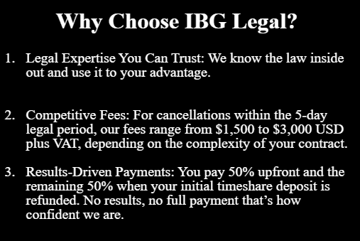 IBG Legal is a Mexican law firm located in Quintana Roo. While their website initially suggests a focus on real estate matters—such as property acquisition, fideicomisos (trusts), and licenses—they also offer services for timeshare cancellations, branding it as "timeshare contract termination."