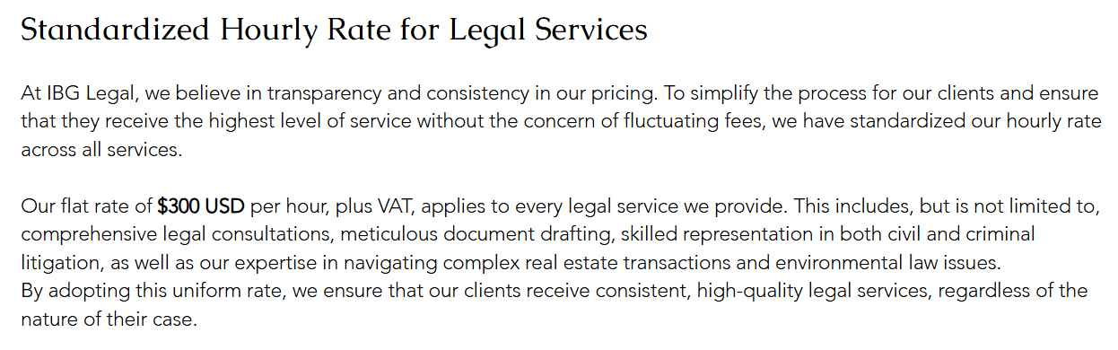 A notable aspect of IBG Legal is their transparent pricing model. Unlike most firms in this field that avoid upfront payments or adjust fees based on the complexity of the case, IBG Legal charges a flat hourly rate of $300 USD, inclusive of VAT. This straightforward approach to billing can be attractive to clients seeking clarity in legal expenses but something for others to avoid.
