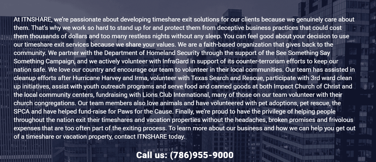 Their “About Us” section is equally puzzling. Instead of focusing on their supposed expertise in timeshare cancellation, it leans heavily into their claimed involvement with humanitarian causes—pet shelters, churches, hurricane relief efforts. Admirable topics, sure, but none of them have anything to do with exiting a timeshare contract. The disconnect is… noticeable.