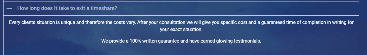 Like many other exit companies, they advertise a money-back guarantee. But here’s where things become a bit vague. They don’t clearly define a timeframe for completing a timeshare exit. Most reputable companies will at least outline an estimated period—commonly around 36 months—and specify what happens if that deadline isn’t met. In this case, Lonestar leaves that window open-ended. That lack of clarity could potentially be used as a loophole, allowing the process to drag on indefinitely without accountability. It’s not definitive proof of wrongdoing, but it is something we would flag for caution.