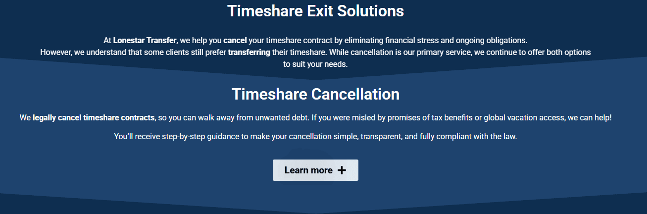 Lonestar Transfer, as their name suggests, is an exit company that specializes in transferring timeshares. This is their primary method of helping users get out of a timeshare, though they also offer what they describe as a mortgage cancellation service.