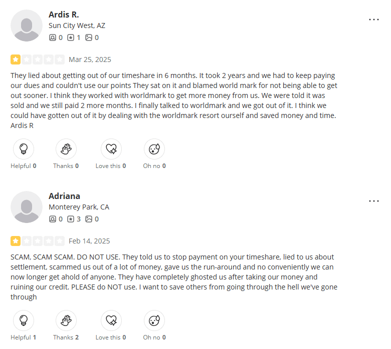 External reviews tell a similar story. Their Yelp page currently sits at around 2.1 stars with roughly 30 reviews, most of them recent and overwhelmingly negative—especially regarding their supposed timeshare exit services. The BBB page isn't much different either.