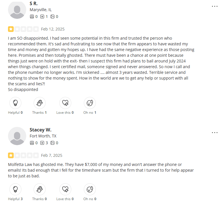 It seems Molfetta Law may have quietly walked away, leaving behind stranded clients, unresolved timeshare exits, and a trail of dissatisfaction.