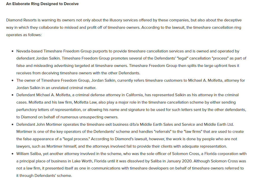 According to court documents cited by PR Newswire (link to article), Molfetta Law allegedly received customer referrals from TFG, and Michael Molfetta himself would sign (or allow his signature to be used on) letters of representation that were sent to Diamond Resorts on behalf of unsuspecting owners.