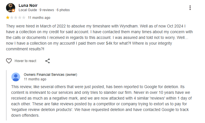 According to one surviving critical review, the company actively reports unfavorable feedback to Google, dismissing it as “slander” or blaming “competitors.” The reviewer even claimed that three prior negative reviews were removed altogether, suggesting Owners Financial Services may have successfully manipulated their online image.