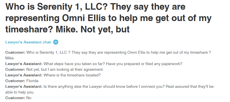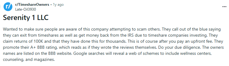 Serenity 1 LLC is a timeshare exit company that, at first glance, looks surprisingly well-receivedâat least if you only check their BBB page, where glowing reviews seem to flood the screen. However, once you step outside that bubble, the picture becomes much less impressive. There are barely any rev...
