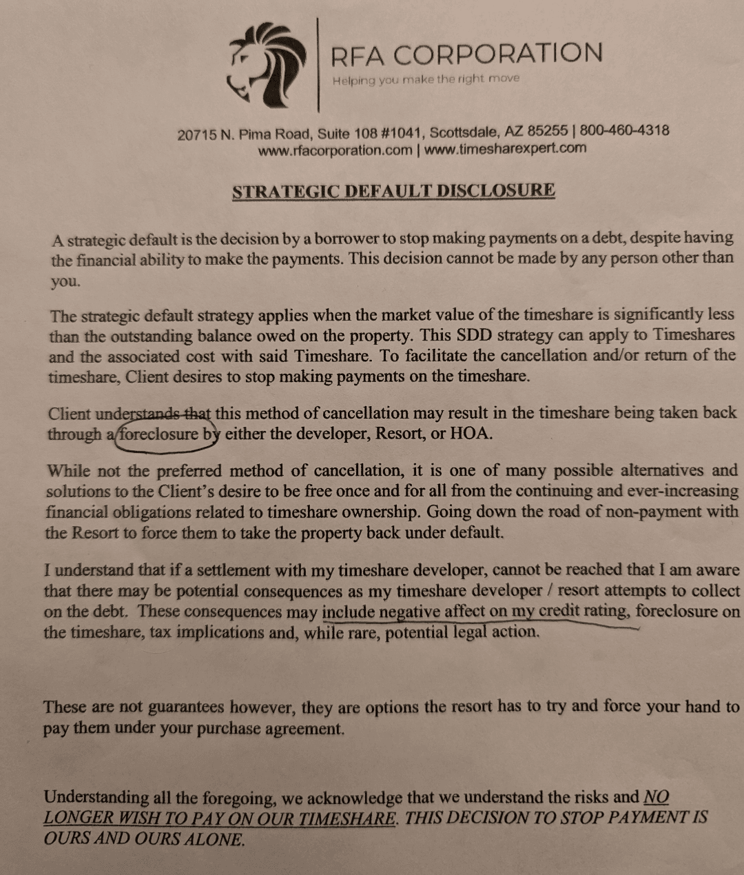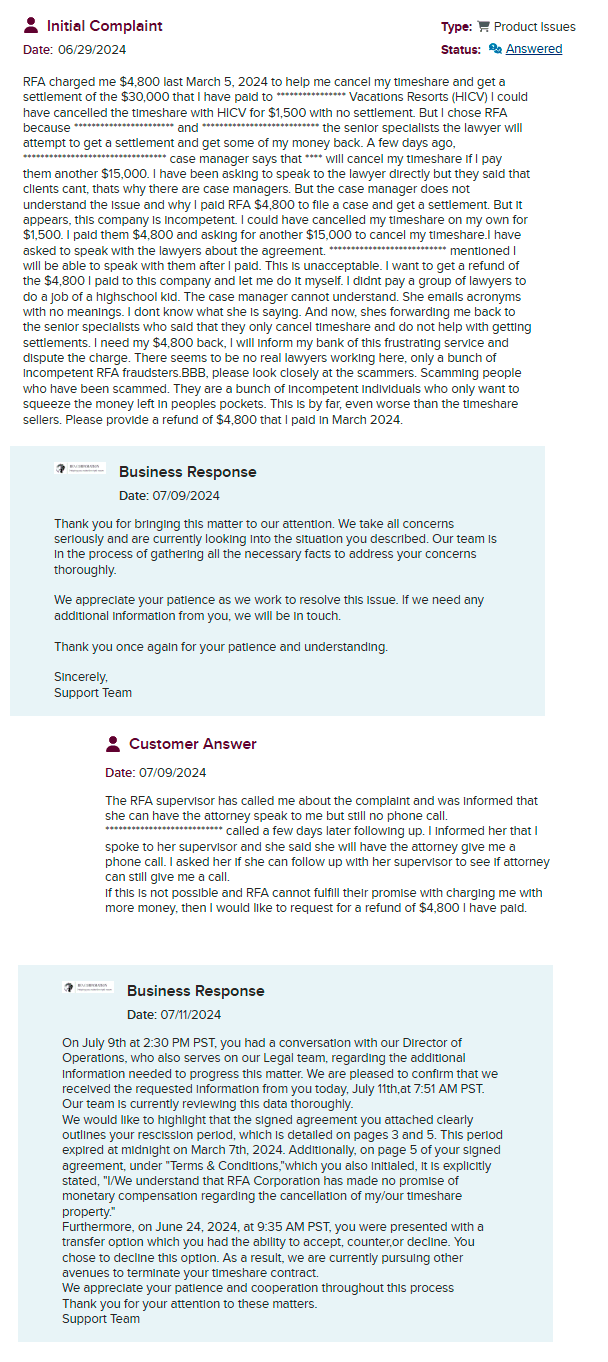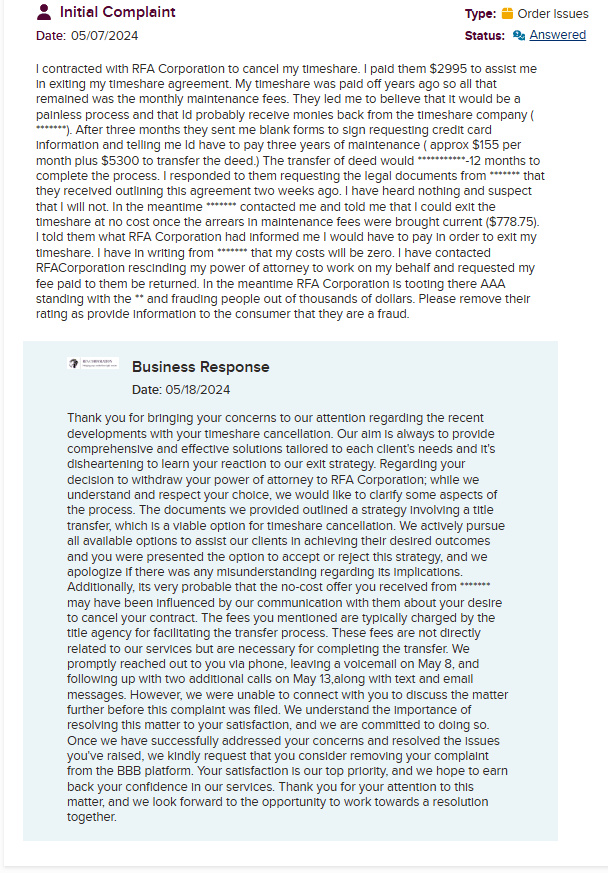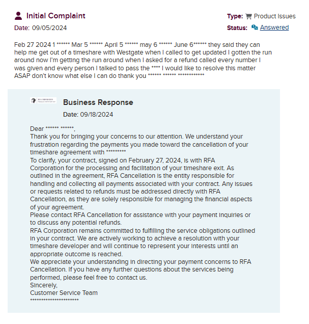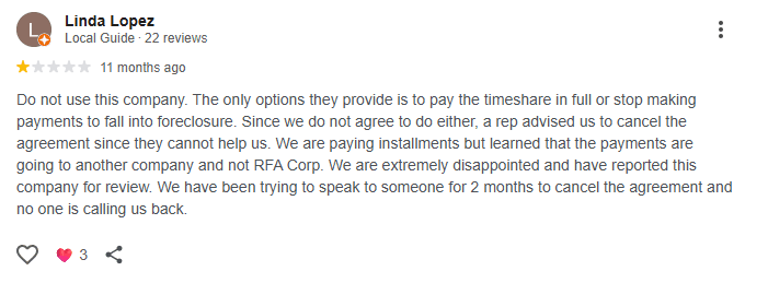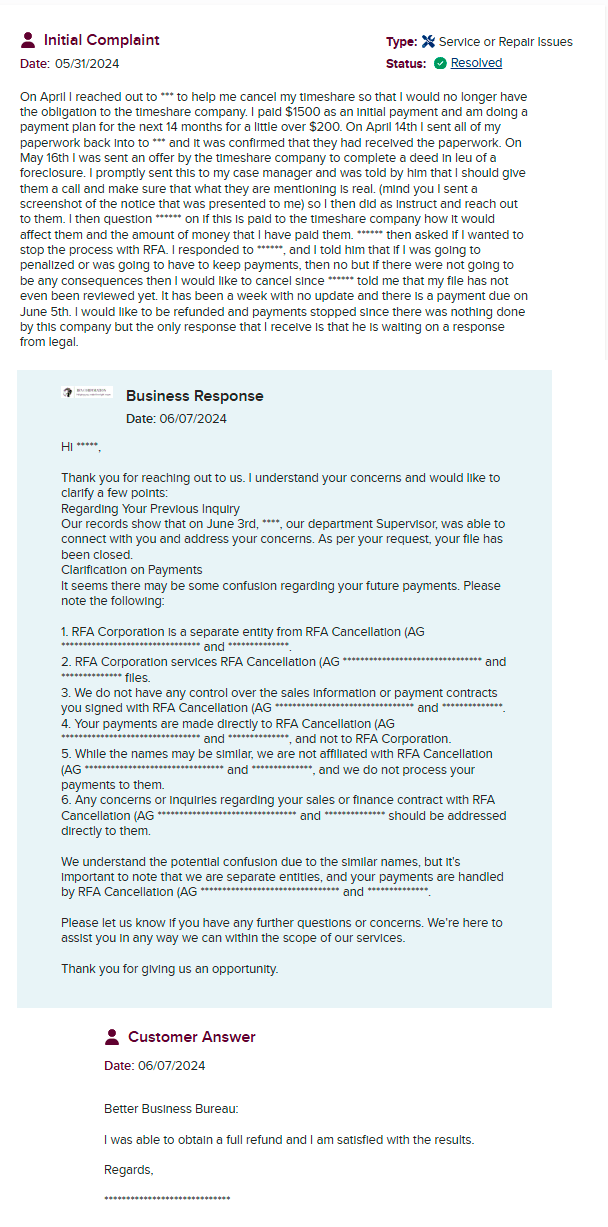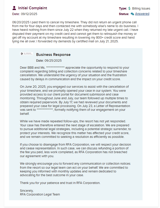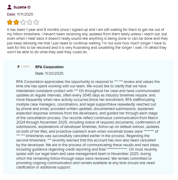 RFA Corporation is a timeshare exit company that presents itself as well-known and active. At first glance, everything seems straightforward, except for the strange overlap in name with another timeshare exit company, RFA Cancellation. According to them, they are ânot affiliatedâ⌠or so they say.