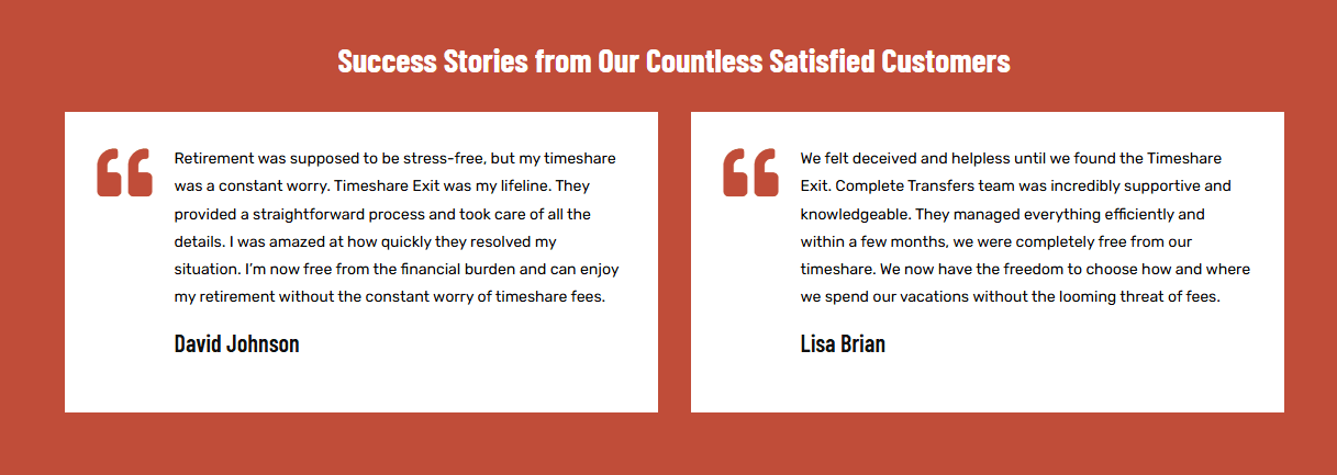 Complete Transfers, also known as Timeshare Transfers, is a brand-new company in the timeshare exit industry, having launched as recently as August 2025. With such a short history, it’s difficult to gauge whether they are trustworthy or just another questionable ...