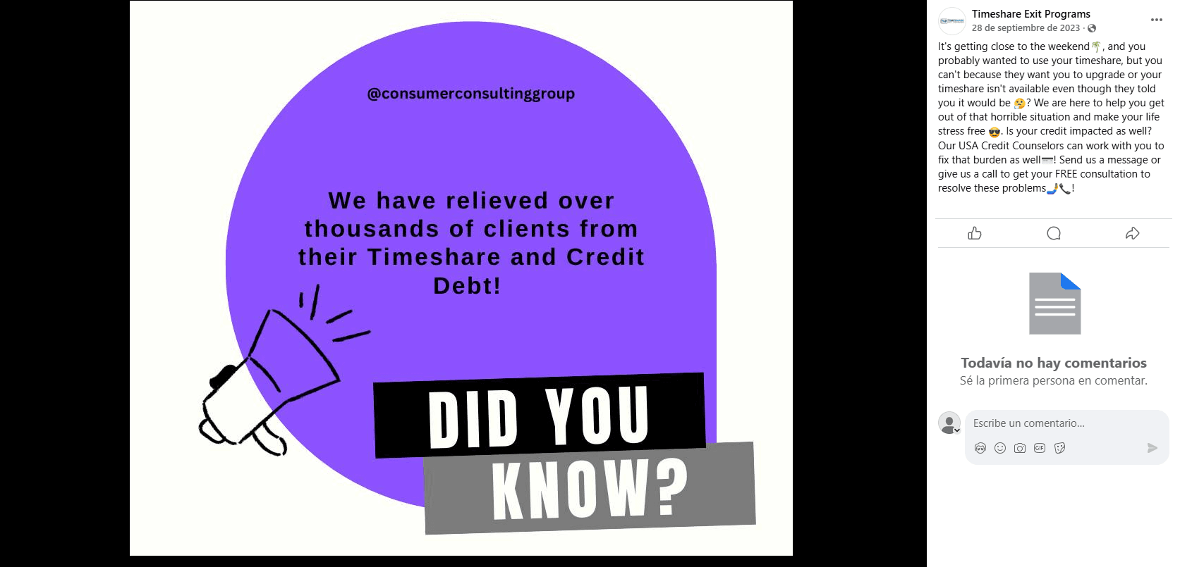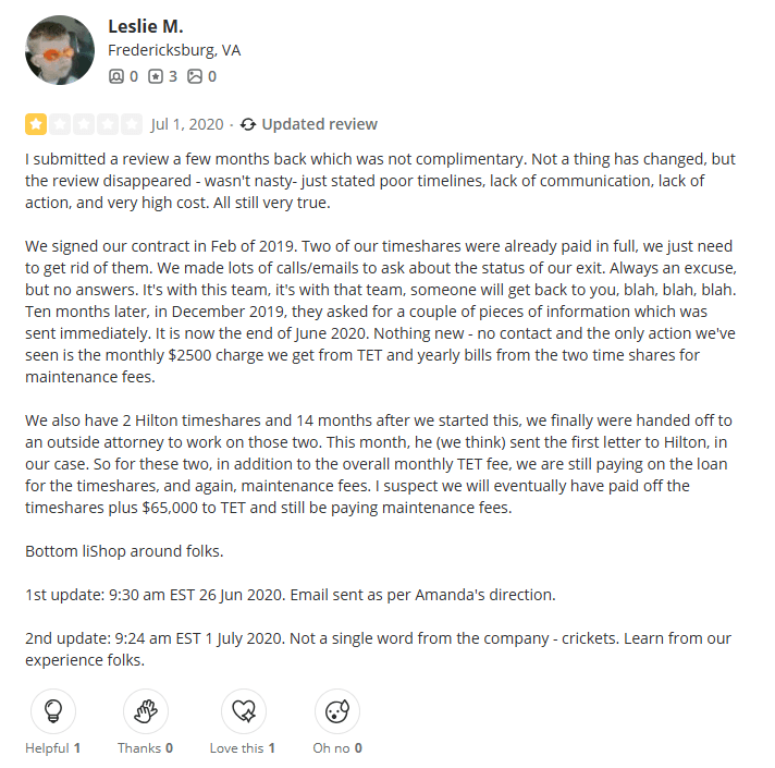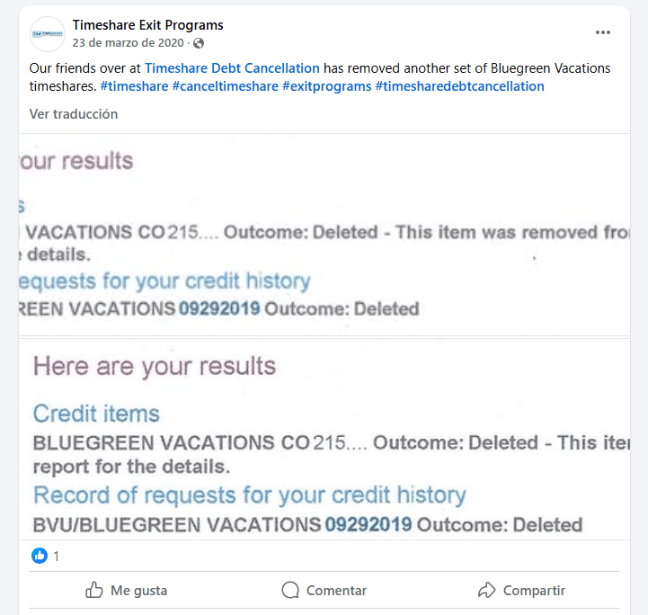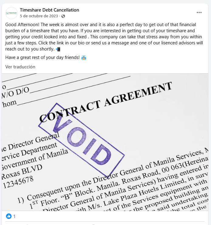 Timeshare Debt Cancellation was once marketed as a timeshare exit firm, originally connected to the website Timeshare Exit Bureau. According to their Facebook page, they surfaced around October 2019, peaked in activity during the height of COVID ...