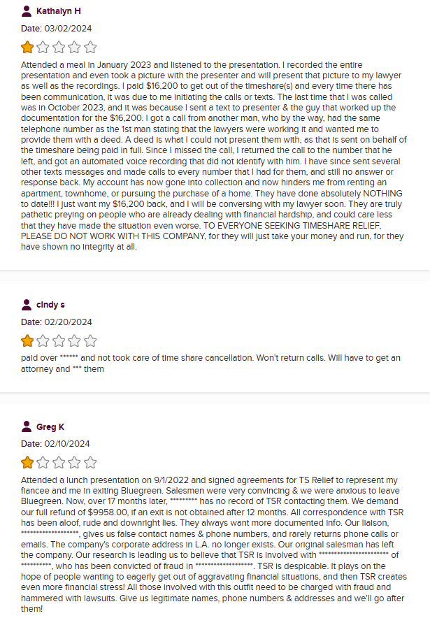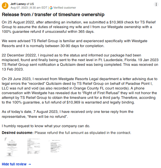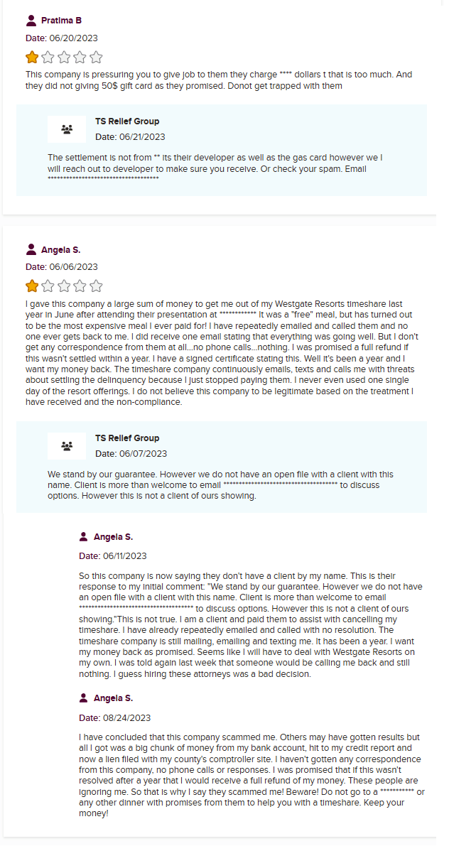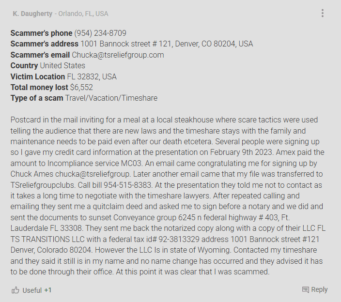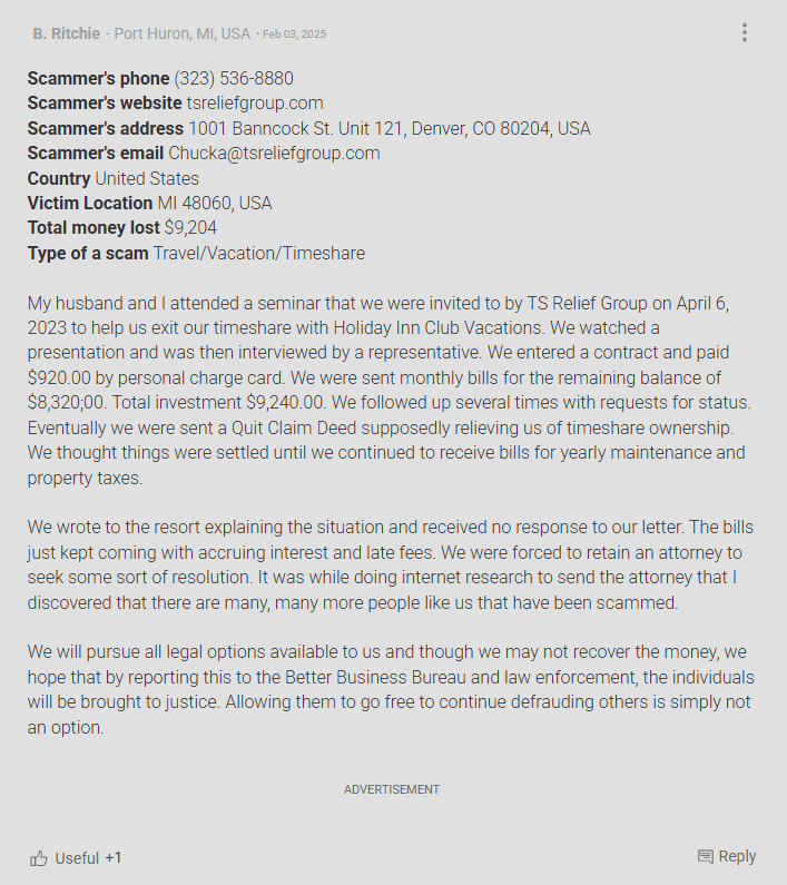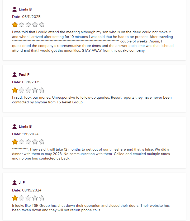 TS Relief Group was a supposed California-based timeshare exit strategy specialist. On paper, they claimed “12 years in service.” In reality, web records show they only surfaced around 2021, a far cry from the polished legacy they tried ...