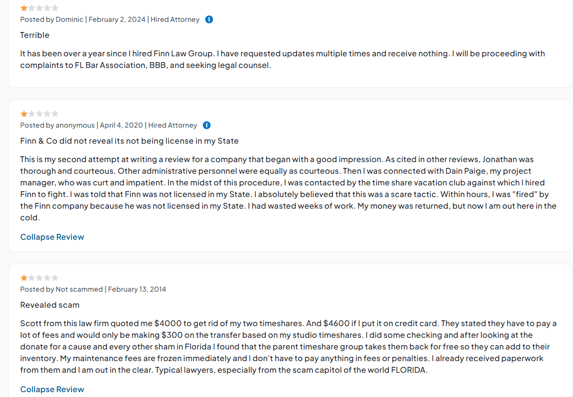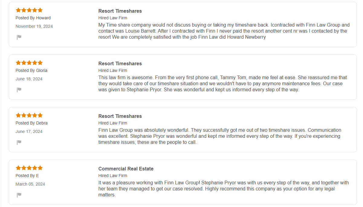 Finn Law Group describes itself as a collective of attorneys specializing in timeshare cancellations. They make a clear distinction between their services and the often-criticized 'exit companies,' emphasizing that attorneys provide more effective and reliable solu...