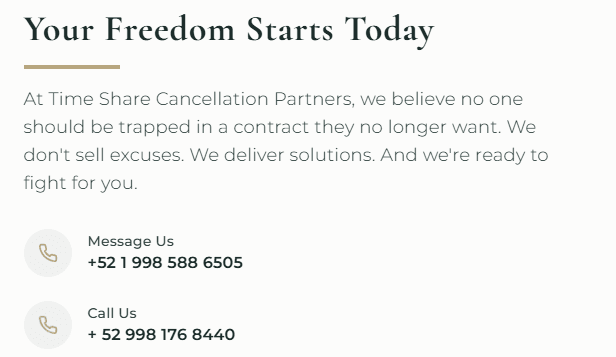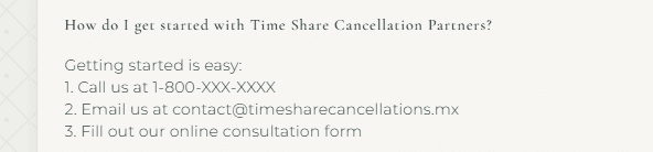 Time Share Cancellation Partners is a newly established (as of 2025) timeshare cancellation company, shrouded in ambiguity and raising several red flags. Despite operating with a ".mx" domain, their website is entirely in English with no Spanish version available, which is unusual for a domain targe...