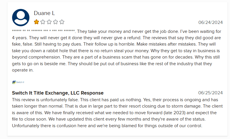 Switch It Title Exchange is a timeshare exit and title transfer company specializing in helping timeshare owners remove a timeshare from their names—whether by transferring the title back to the resort or finding another owner. According to their Better Business Bureau (BBB) profile, they are a BBB-...