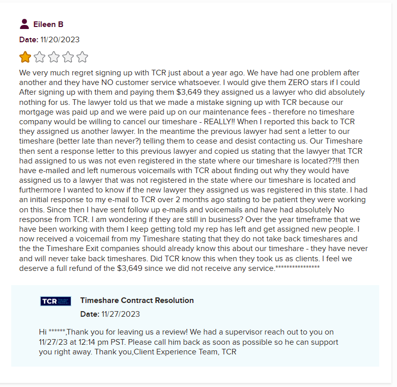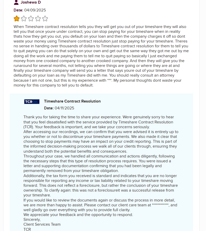 As noted in a previous review of Timeshare Compliance (TC), Timeshare Contract Resolution (TCR) appears to be yet another branch of the same operation—just dressed up under a different name. While the Timeshare Compliance website was created earlier, TCR popped up around 2019. By now, its domain loo...